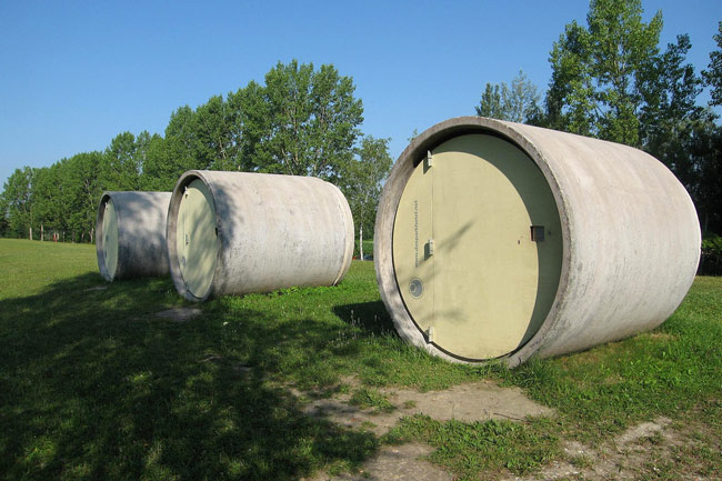 Dasparkhotel is a concept hotel by Andreas Strauss in which guests stay in converted drain pipe sections that are placed in a city park. Made out of sewer pipes, it holds basic accommodation with a bed for two and a light source, with ample space to store your luggage and use your electrical appliances.